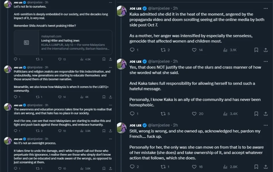 Kaka Azraff herself has yet to respond to netizens’ comments, however, one person was willing to speak on her behalf. Music manager and social media consultant Joe Lee revealed that he spoke with Kaka after the issue went viral. In a thread, he stated that he had a long phone conversation with the local celeb about her poor choice of words and explained to her how she was wrong for using them.