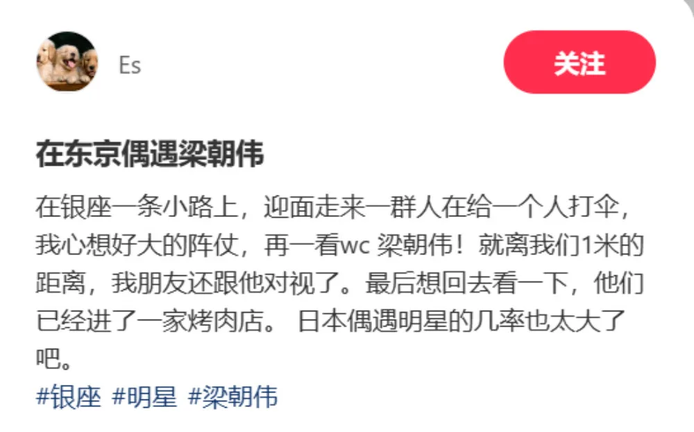A XiaoHongShu user recently posted a video with the captions, “I met Tony Leung in Tokyo. On a small street in Ginza, a group of people walk towards us, holding umbrellas for someone. It seemed like a big deal. Then, I looked over and saw Tony Leung!”. The user also noted that the star and his entourage entered a barbecue restaurant.