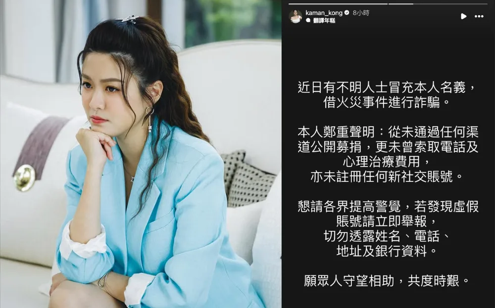Kaman is one of the few celebrities who have warned the public of scammers taking advantage of the disaster. Social media personality Kathy Ngai (倪安慈) also recently released a video to warn the public, particularly the elderly, about a scam targeting victims of the fire. Kathy explains that scammers have been posing as volunteers, distributing a victim registration form to those affected by the disaster.