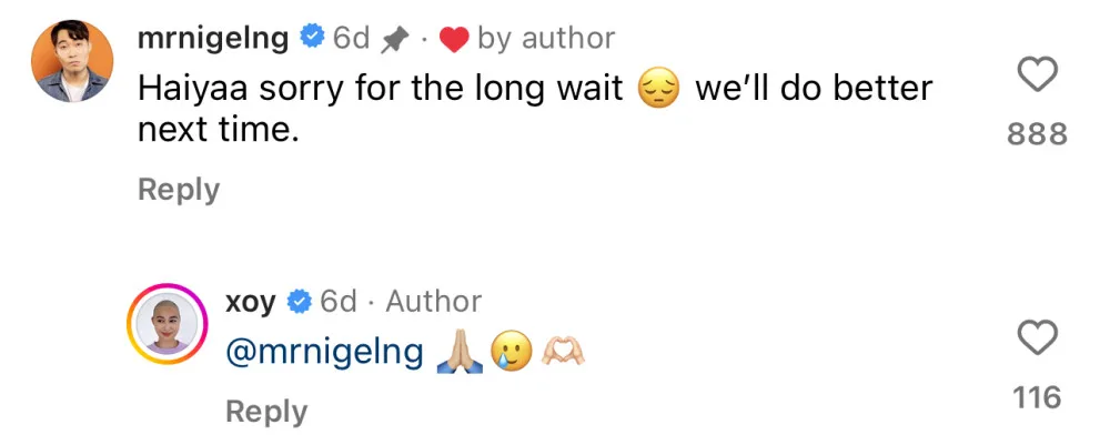 Shortly after the Instagram Reel went viral, Nigel Ng himself apologised for the service by commenting, “Haiyaa, sorry for the long wait 😔 we’ll do better next time.” Lukian acknowledged his apology with a simple hand gesture emoji and a crying emoji, as seen in the screenshot above. Hopefully, the entertainer will take the criticisms seriously and improve his restaurant’s service if he plans to open another outlet in the future.