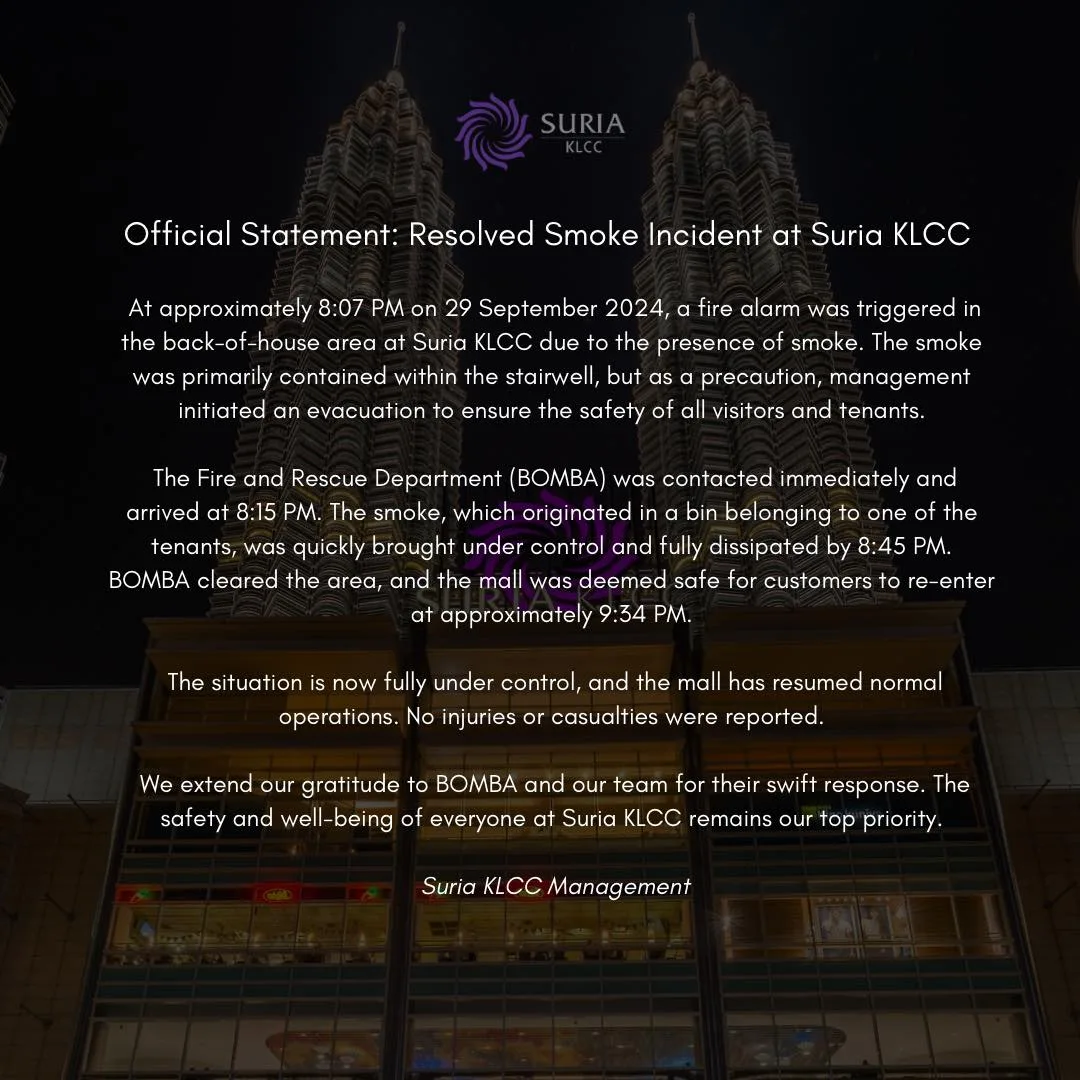 Suria KLCC has issued a statement to explain the situation, which they have since resolved. According to the shopping mall, smoke was present in the back-of-house area of the building, which triggered a fire alarm. The statement explains that the smoke came from a small fire that broke out in a rubbish bin within the stairway. Suria KLCC mentioned that the bin belonged to one of the mall’s tenants but didn’t disclose the exact cause of the fire. Eyewitness accounts indicated that smoke was also present in the motorcycle parking area.