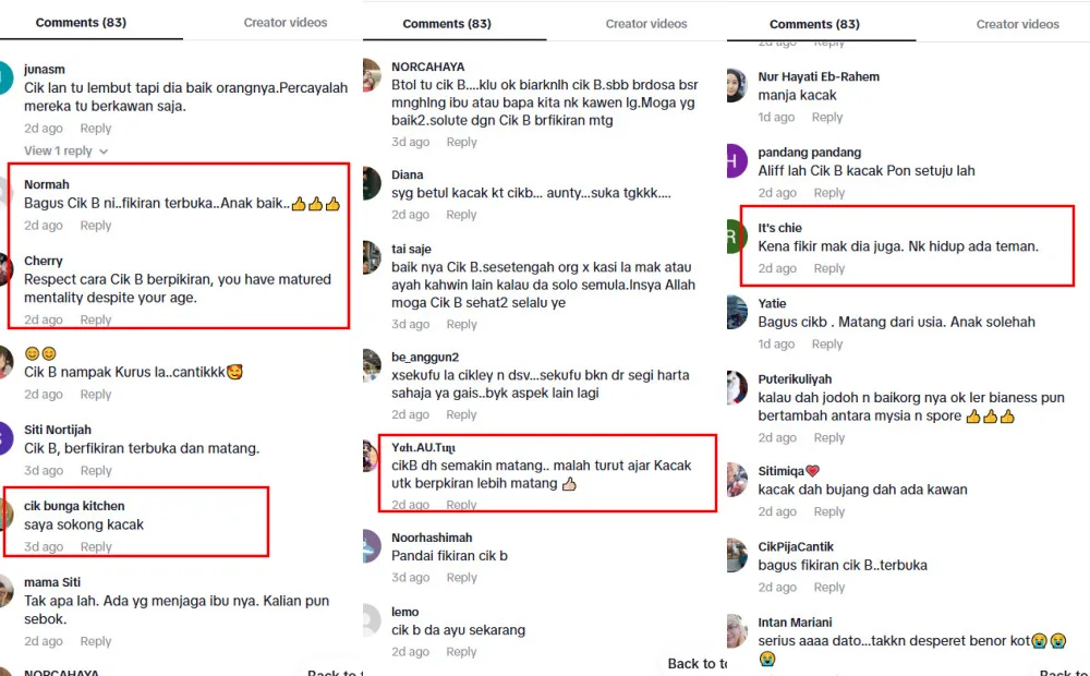 In the comments section, fans praised Cik B for her maturity and for being considerate of her mother. Many agreed with her view that there is no reason to stop DS Vida from dating or remarrying, provided her partner treats her well. Others, however, shared Kacak’s reservations, admitting they were not in favour of Cik Lan becoming their stepfather.