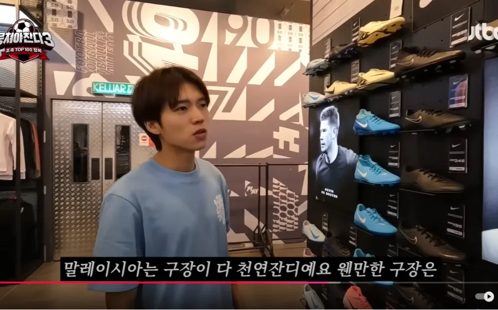 Upon reaching the outlet mall, Woohyun expressed awe at the view from the hilltop. When shopping, the idol showed off his local football knowledge, noting that most of the fields in Malaysia use grass instead of artificial turf. As such, most football boots sold locally are for grass-turf use. Woohyun continued shopping for football gear, meticulously going through the selection at the store to find the right one for him.