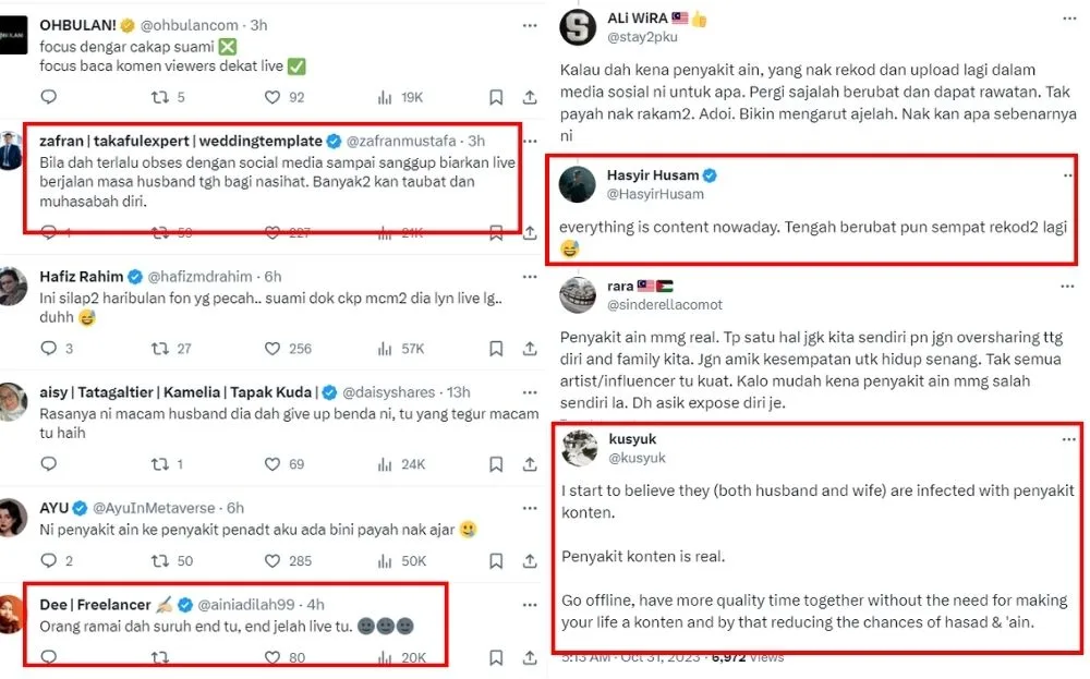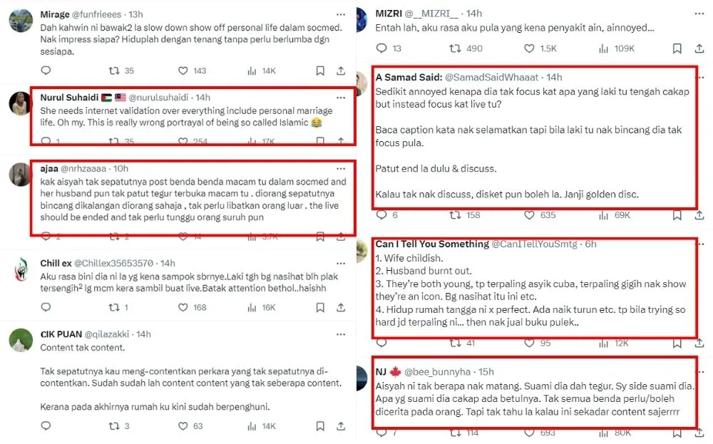 The video led many to deem the influencer immature because of her behaviour and her dependency on her followers. Many also think that Aisyah is desperate for attention, thus believing that she needs to post everything on social media to get validation from netizens. Netizens also called out her husband Alif for having the private conversation, knowing she was on a live stream.