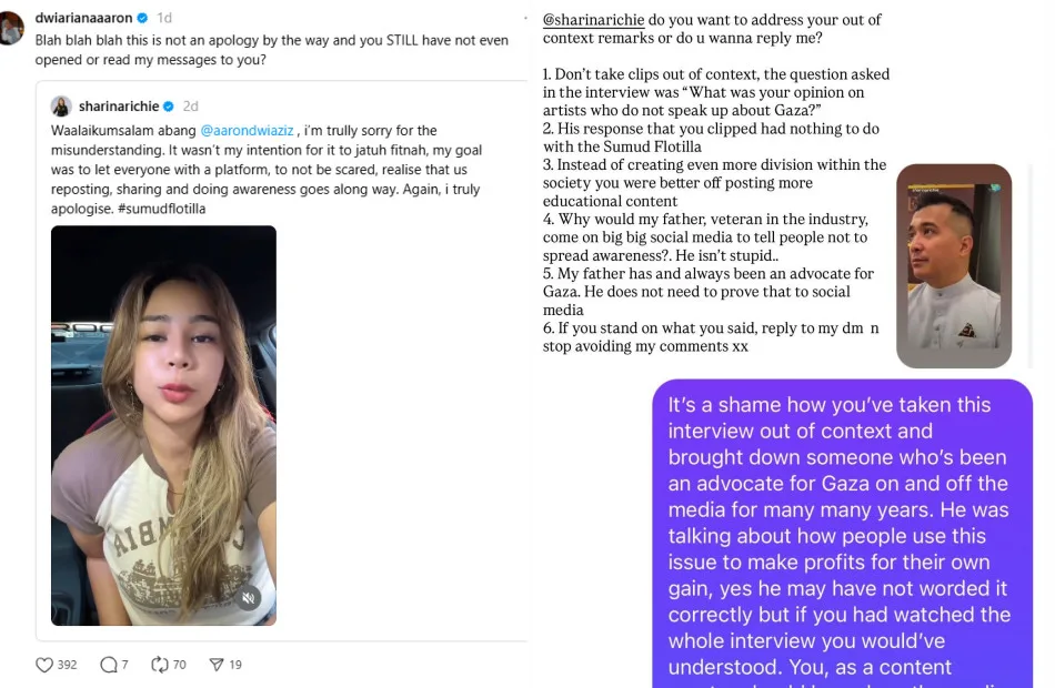 Content creator Sharina Richie posted a now-deleted video of Aaron Aziz appearing to make a controversial remark about people not taking more effection action to provide help to fight against injustice, other than sharing videos. The influencer criticised him, saying that he should encourage everyone to continue sharing information online, as that could be one of the few ways they are able to help.