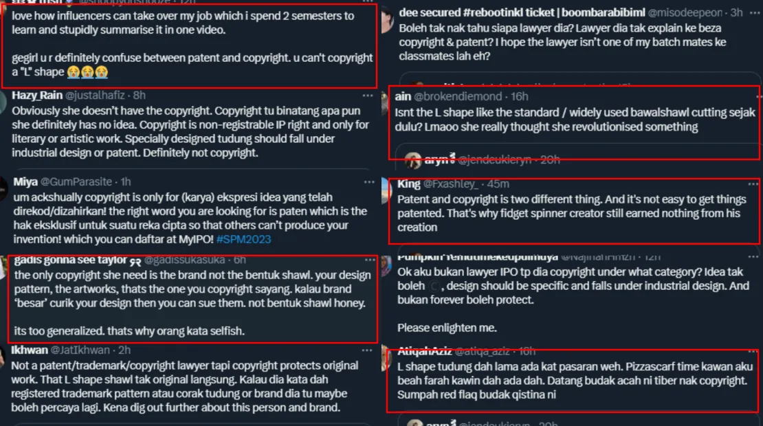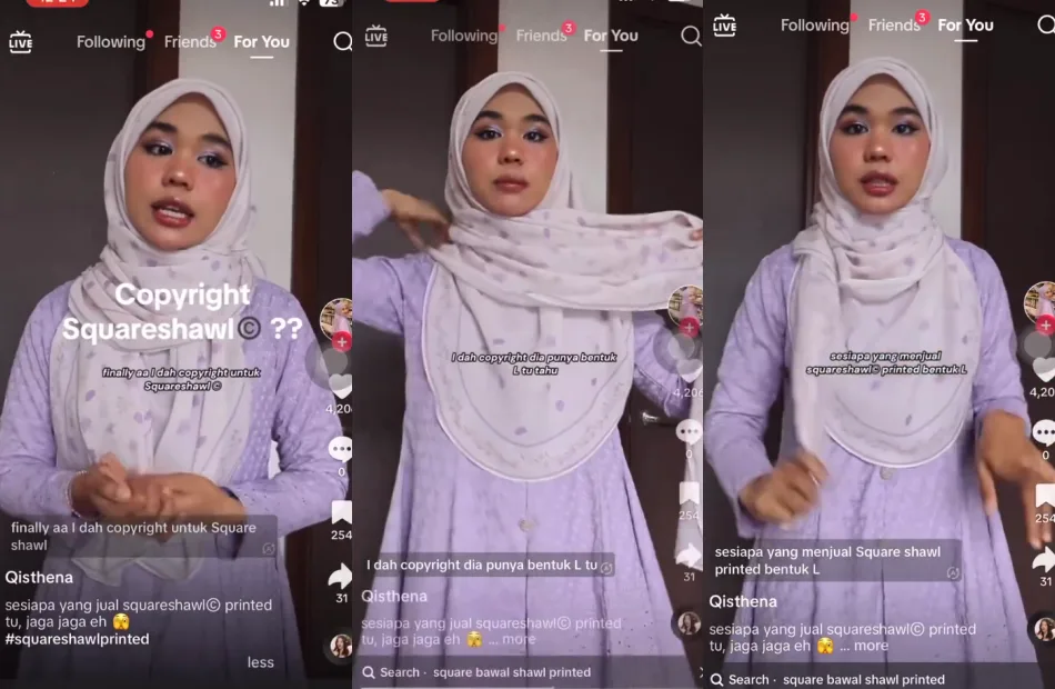 According to several comments by netizens as well as MyIPO, copyright is to protect artistic, literary, or intellectually created works whereas a patent is an exclusive right granted for an invention which can give a fresh approach to a problem or a new technical solution. It is said that if Qisthena wanted to protect her own original invention then it should fall under patent but since she is technically not the creator of the L-shaped shawl, her application to earn the rights would be rejected.