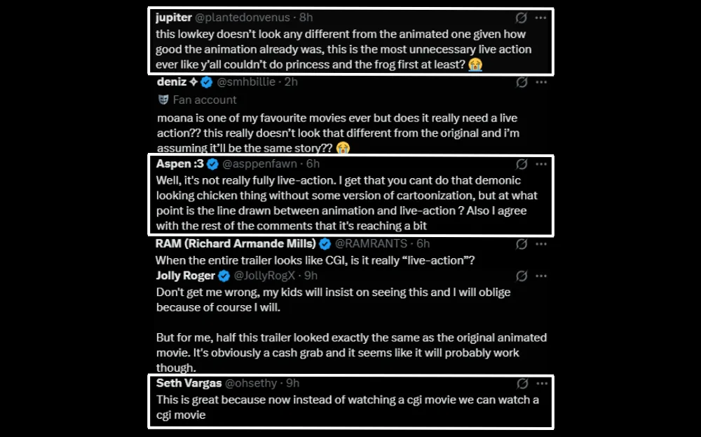 Another common talking point is the blurred boundary between animation and live action itself. With scenes of gravity-defying water, characters soaring through the air, and Maui seamlessly transitioning into various creatures, viewers questioned whether the film is truly “live action” in spirit. As one user pointed out, “At what point is the line drawn between animation and live-action?” The heavy reliance on CGI has led many to compare the film to Disney’s previous photorealistic remakes like “The Lion King”, “The Jungle Book”, and “The Little Mermaid” which also prompted similar debates.