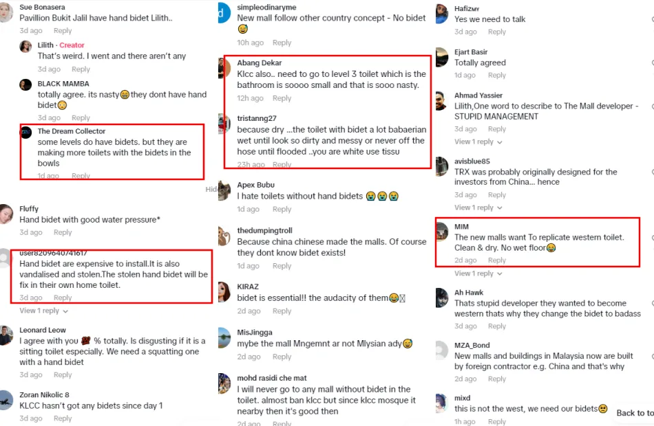 Lilith’s viewers, most of whom are Malaysians, all agreed with her statement that there had been a lack of hand bidets in newer malls. Some suspected that it’s probably because the bidets are expensive to install and are easily vandalised or stolen. Others believe that it’s because the developers want the restrooms to appear clean and dry. A few clarified that some of these malls do have hand bidets but not on every floor.