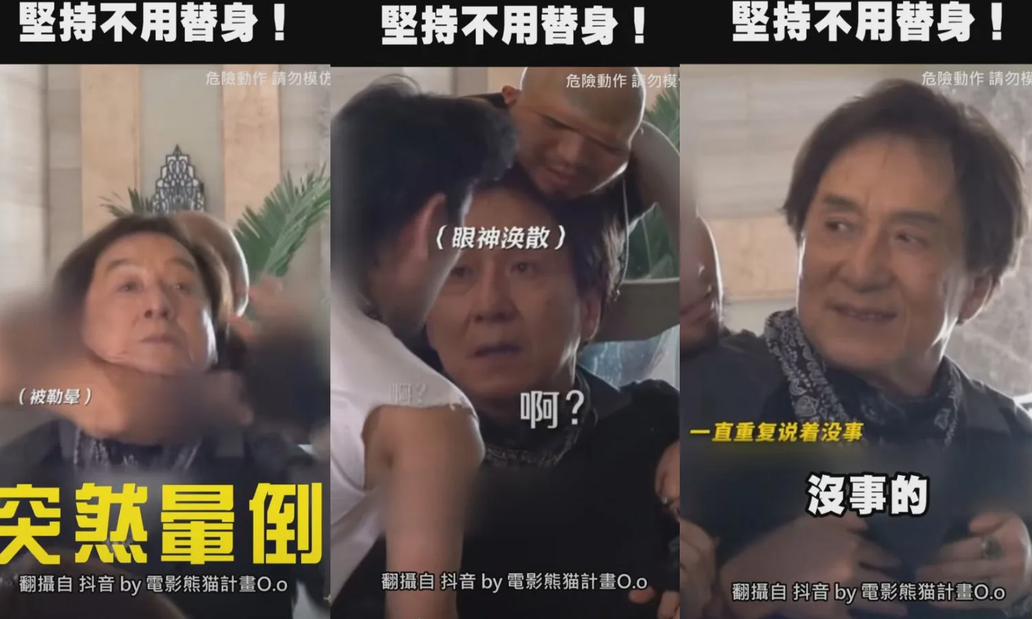 In the video, it can be seen that Jackie getting headlocked during a stunt for a scene in the movie. Then suddenly, the actor lost his consciousness and eventually fell to the ground. The scene partner quickly grabbed his body to stay upright while other crew rushed to check up on him.