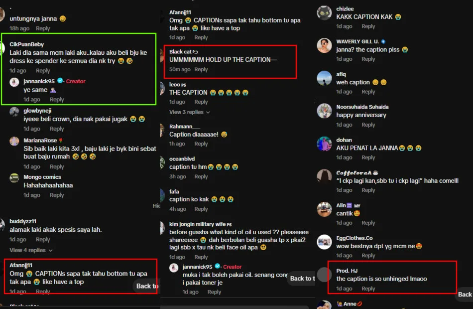 At the end of the video, Dini was seen taking off his wife’s veil from her head before placing it onto his own out of curiosity. When the “Gatal” singer asked why he was wearing it, the actor replied that he just wanted to see how it looked on him. With this context in mind, Janna just wanted to poke fun at her man’s soft nature, hence the “Bottom” caption.