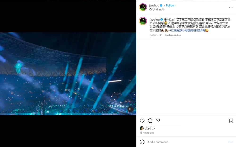 After hearing the fan, Jay couldn’t help but be overwhelmed by the sincere confession and genuine praise. The vocalist started to tear up as he began singing the requested song, “Maple Leaf (楓)”. He also repeatedly wiped his tears with his shirt sleeve. The moment also went viral on Chinese social media, with many claiming this was the first time they saw Jay cry on stage. Many fans also said they were also moved by the fan’s words.