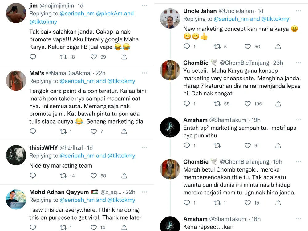 Then the following tweet by Hafidz Hamzah revealed the truth behind the viral video. Apparently, the whole thing was actually just a cheap marketing trick to promote a new vape flavour called, “Jantan Tak Guna” by Maha Karya – the exact words scribbled all over the car. If you carefully rewatch the video, you’ll see that among the many vile phrases on the car, there is one that says “Maha Karya”.