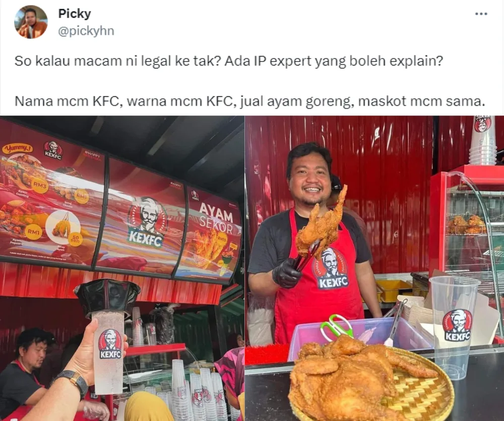 Twitter user Picky recently shined the spotlight on the KEXFC fried chicken stall that appears to be a copy of the international fast food chain KFC. In the photos he shared, the KEXFC stall appeared to have many similarities to KFC, from the colour scheme down to the logo, which also features a man with a beard. In his captions, the Twitter user asked, “Is it legal in this case? Can any IP expert explain? Name like KFC, colour like KFC, sell chicken, (and) the mascot is the same.”