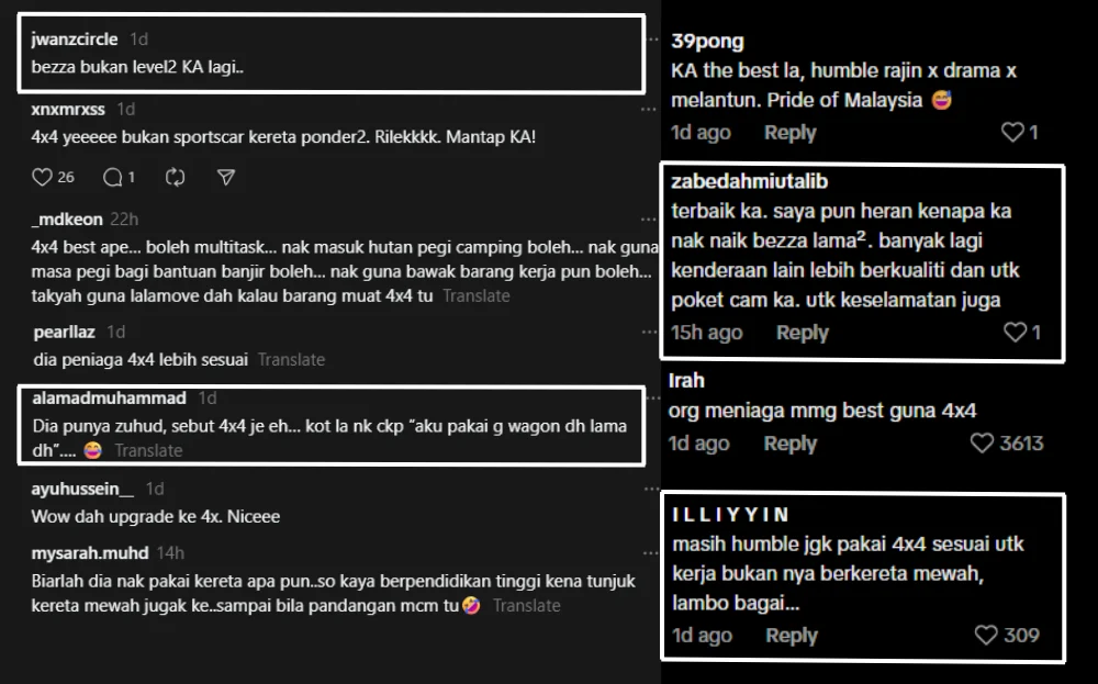 In the comments section, many netizens agreed that a 4×4 vehicle made more sense for someone managing businesses and operations, describing it as a practical choice rather than a flashy one. Some continued to praise Khairul Aming for maintaining his humility, even though he has chosen not to disclose the brand of his new vehicle.