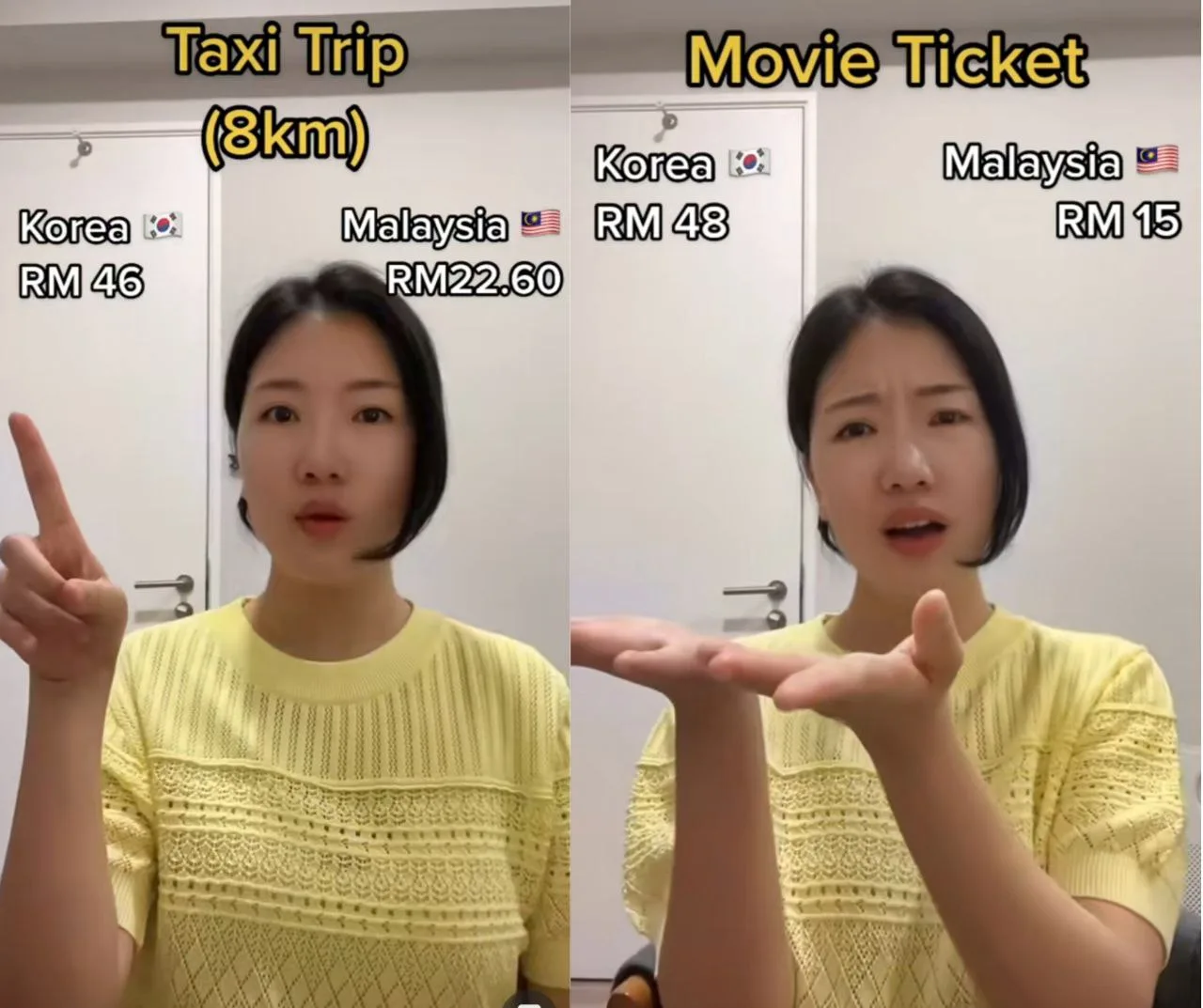 In the video, the Korean beauty compared 4 different daily ‘essentials’ in both Malaysia and Korea. These 4 products and services include50 litres of petrol, 330ml of bottled Coca-Cola, an 8km taxi trip and a movie ticket.