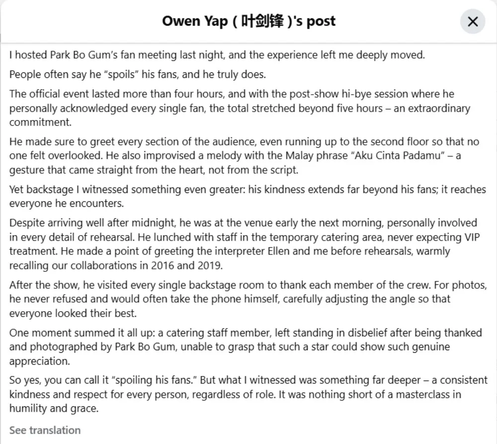 They say you can learn a lot about someone’s personality by hearing how others talk about them. After hosting Park Bogum’s (박보검) recent fan meeting in Kuala Lumpur, Malaysian media personality Owen Yap (叶剑锋) had nothing but praise for the star.