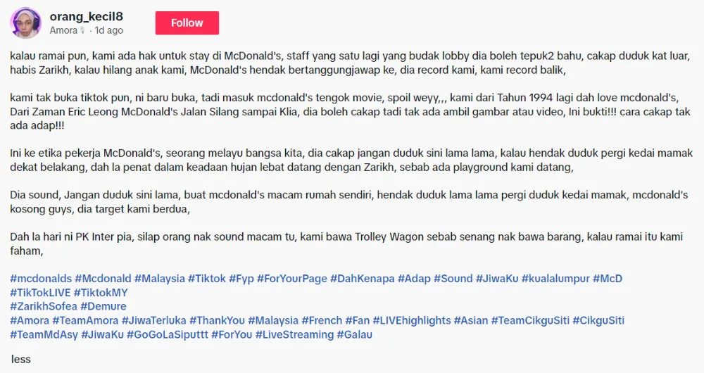 @orang_kecil8 kalau ramai pun, kami ada hak untuk stay di McDonald’s, staff yang satu lagi yang budak lobby dia boleh tepuk2 bahu, cakap duduk kat luar, habis Zarikh, kalau hilang anak kami, McDonald’s hendak bertanggungjawap ke, dia record kami, kami record balik, kami tak buka tiktok pun, ni baru buka, tadi masuk mcdonald’s tengok movie, spoil weyy,,, kami dari Tahun 1994 lagi dah love mcdonald’s, Dari Zaman Eric Leong McDonald’s Jalan Silang sampai Klia, dia boleh cakap tadi tak ada ambil gambar atau video, Ini bukti!!! cara cakap tak ada adap!!! Ini ke etika pekerja McDonald’s, seorang melayu bangsa kita, dia cakap jangan duduk sini lama lama, kalau hendak duduk pergi kedai mamak dekat belakang, dah la penat dalam keadaan hujan lebat datang dengan Zarikh, sebab ada playground kami datang, Dia sound, Jangan duduk sini lama, buat mcdonald’s macam rumah sendiri, hendak duduk lama lama pergi duduk kedai mamak, mcdonald’s kosong guys, dia target kami berdua, Dah la hari ni PK Inter pia, silap orang nak sound macam tu, kami bawa Trolley Wagon sebab senang nak bawa barang, kalau ramai itu kami faham, #mcdonalds #Mcdonald #Malaysia #Tiktok #Fyp #ForYourPage #DahKenapa #Adap #Sound #JiwaKu #kualalumpur #McD #TikTokLIVE #TiktokMY #ZarikhSofea #Demure #Amora #TeamAmora #JiwaTerluka #ThankYou #Malaysia #French #Fan #LIVEhighlights #Asian #TeamCikguSiti #CikguSiti #TeamMdAsy #JiwaKu #GoGoLaSiputtt #ForYou #LiveStreaming #Galau