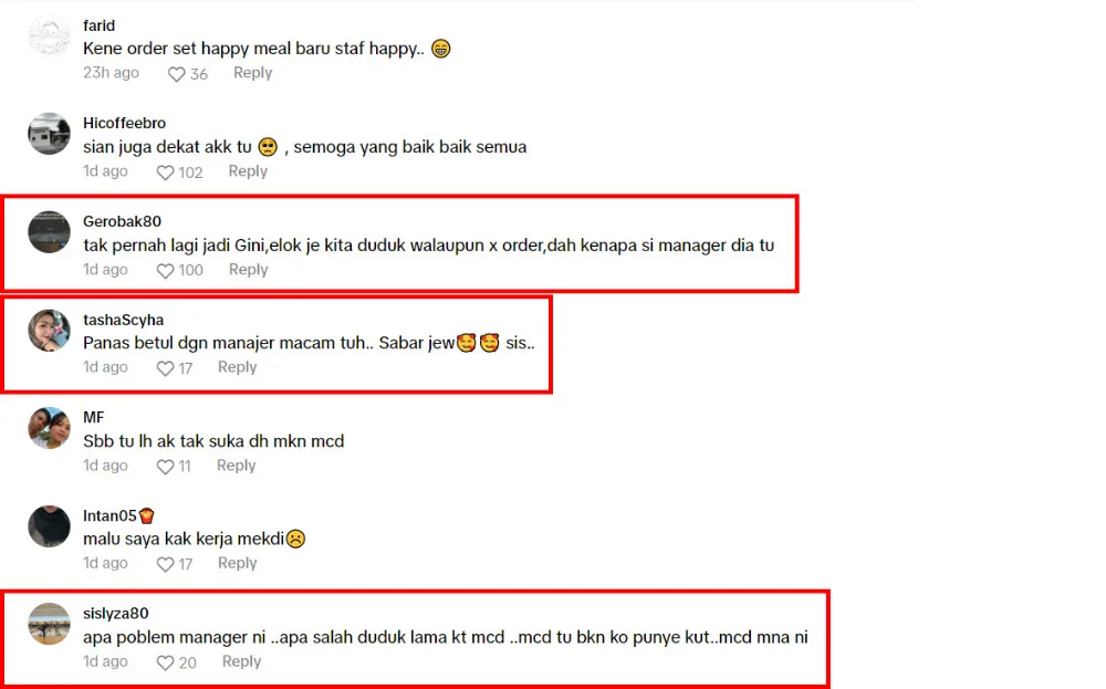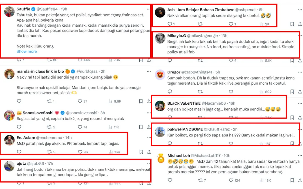 Many also argued that most restaurants in Malaysia don’t allow non-paying customers to stay on the premises, with most saying it’s loitering. Others commented that the mother should follow the rules of the restaurant instead of acting entitled because they’re a customer. Some also contended that McDonald’s is under a global boycott, so Amora’s video doesn’t paint her in a good light either way.