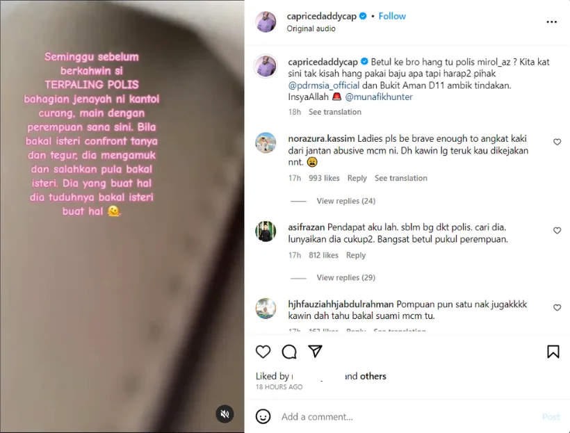 The video also prompted many to investigate the man, revealed to be a police officer named Amirul. Many have also found his Instagram account, leaving him messages and comments regarding the viral video. Netizens have also pointed out that the alleged abuser doesn’t show any remorse as he had posted Stories that implied so.
