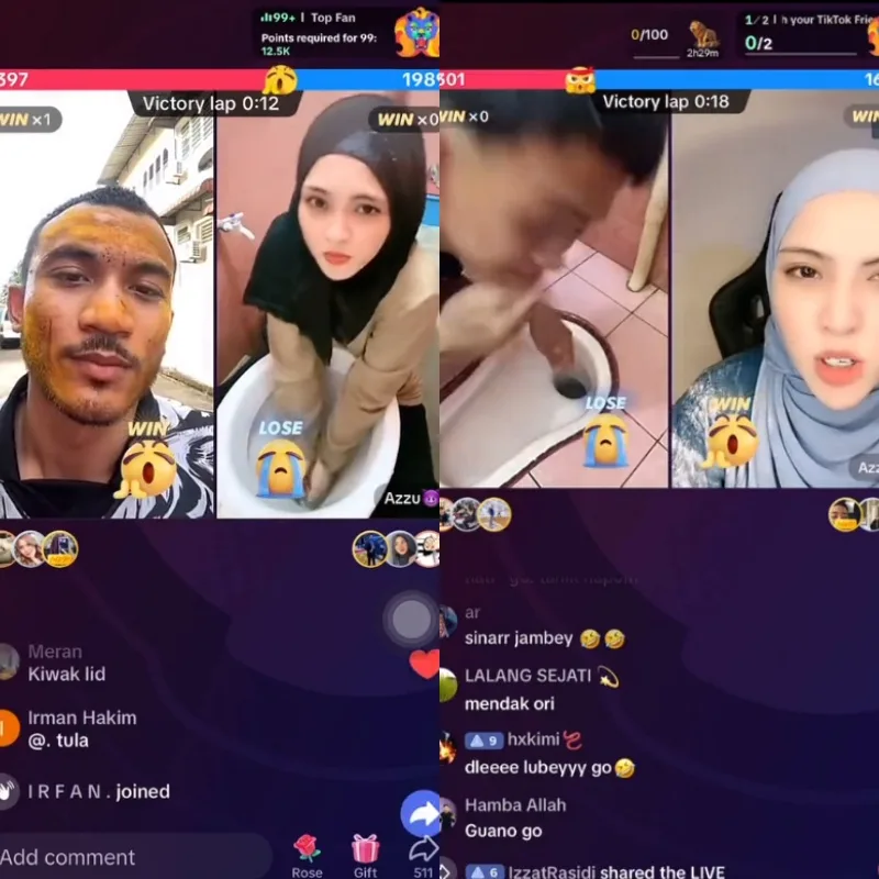 Over the weekend, a netizen who goes by Komandan Marco posted screen recordings on Facebook of two unnamed TikTokers carrying out a forfeit where the loser must wash their face using toilet water during their TikTok live stream. The first video showed a young woman with her hands in the toilet bowl before splashing the water onto her face while being observed by her collaborator @cengkoimanja.