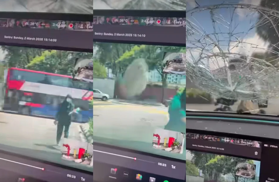 Recently, a Facebook user, possibly the car owner, posted a video in the DashCam Malaysia Facebook group showing a shattered windshield before the camera panned to a dashcam recording. In the captured footage, a masked woman is seen approaching a Tesla car with a large stone in her right hand while carrying documents in her other hand.