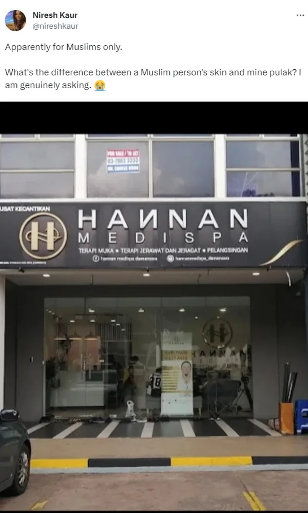 Niresh Kaur shared through Twitter an image of a Hannan Medispa branch with the caption, “Apparently for Muslims only”. According to local reports, the netizen was surveying beauty parlours for spa packages when she called the Jaya One branch of Hannan Medispa. However, after receiving details about a facial package, the spa staff said the service was for Muslim women only.