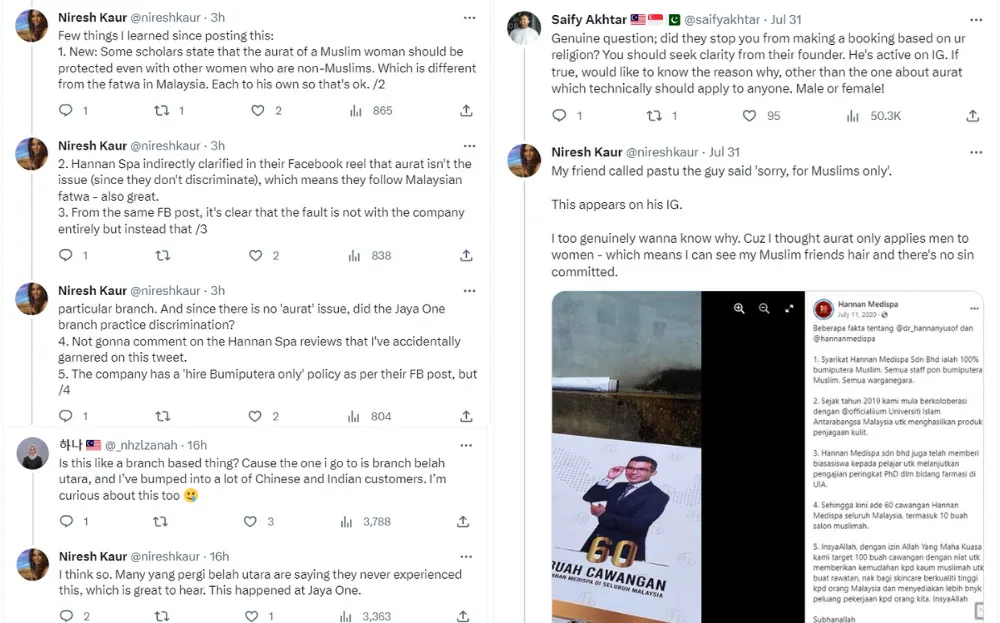 Hannan Medispa is known as a Muslimah-friendly beauty parlour frequented by hijab-wearing Muslim women, which points to the Muslim woman’s ‘aurat’ being the reason for the company not accepting non-Muslim customers. However, the Twitter user was still curious if she, a woman, is not allowed to see Muslim women’s ‘aurat’ since it was not something she had issues with before.