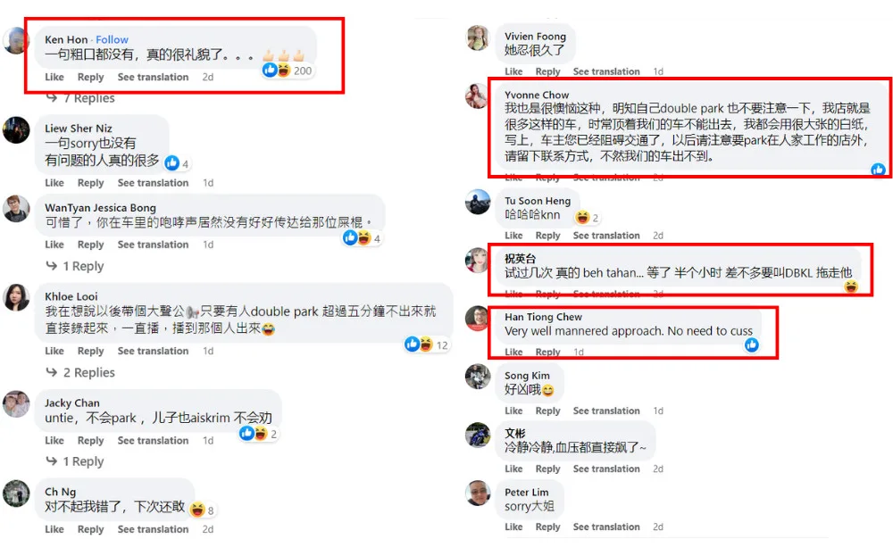 Many netizens praised Macy for calmly dealing with such a frustrating situation, even adding a ‘please’ after speaking to the driver. Some said she was smart for venting in the car before approaching the driver to avoid unnecessary violence. Other comments also sympathised with her, sharing their annoyance towards people who double park.