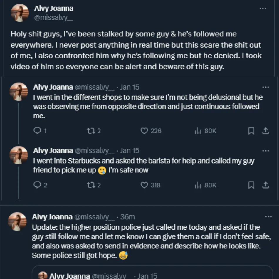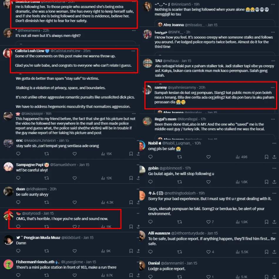 Alvy went to file a report at the police station and thankfully, one of the higher-ups called to check on her well-being, offering that she could call them whenever she felt unsafe. “They asked me to send in evidence and describe what he looks like if I ever see that man again,” she said. At the time of writing, there has been no update on the case but we hope that Alvy is doing better now.