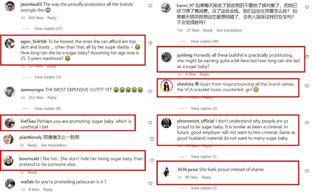 Some netizens claim that the “sugar baby” might not be truthful about her luxury items. Many claim that her bag and jewellery are counterfeit, based on how they look compared to the real deal. These claims also led to many netizens shaming her for using fake branded items to present a luxurious lifestyle.