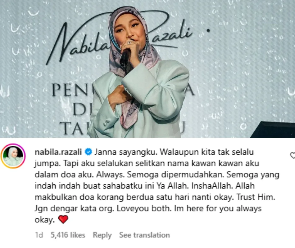 In her heartbreaking post, Janna revealed that she had asked her friend, singer Nabila Razali—who is currently pregnant—to step on her toe, as it is an old superstitious belief that an expecting woman can bless the next person to conceive. The songstress commented on the post saying that she should not give up trying and trust in Allah that He would bless her with a child one day.