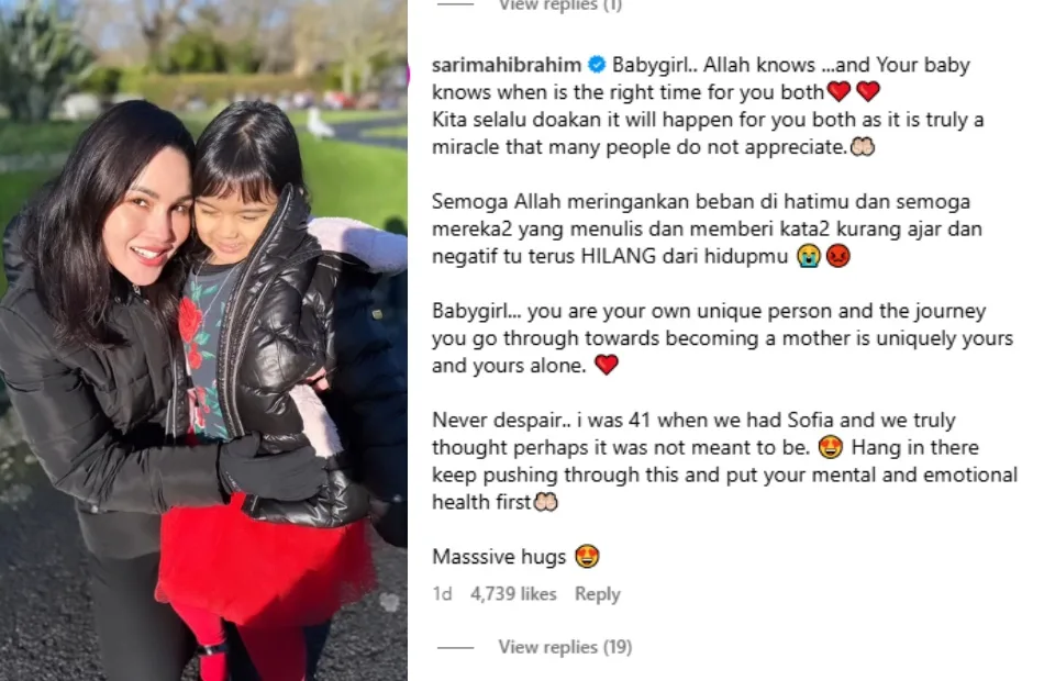 Popular TV personality and actress Sarimah Ibrahim shared her experience of having children at a later age. “Baby girl, only God knows when will be the right time for us to have kids. You’re unique and your journey to motherhood is your own. Never give up. I was 41 years old when I had my daughter Sofia and honestly thought it would never happen. Be patient and prioritise yourself,” she commented.