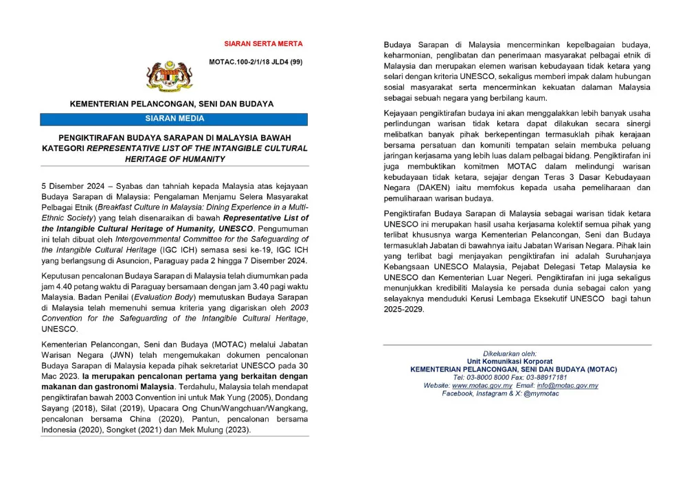 The announcement was made on 5th December 2024 (Thursday) during the 19th Session of the Intergovernmental Committee for the Safeguarding of the Intangible Cultural Heritage in Paraguay. According to MOTAC, the inclusion came after the evaluation body concluded that Malaysia’s breakfast culture met all the criteria outlined by UNESCO. The ministry submitted the nomination through the National Heritage Department in March 2023.