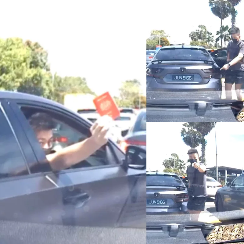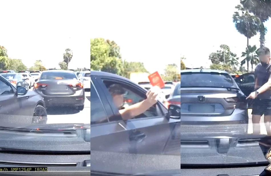 Facebook user Joanna Loh posted on her profile on Saturday (6th August) several videos and screenshots taken from her car’s dashcam to expose this man who was trying to cut queue on the road at the Malaysia-Singapore Second Link heading towards Johor Bahru. The man apparently took out and flashed his Malaysian passport to the driver behind him signaling her to let him through.