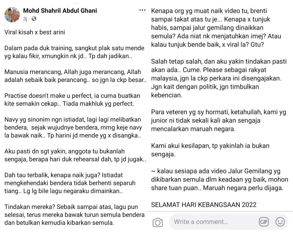 The truth of the matter has been revealed by a netizen on Facebook. Mohd Shahril Abdul Ghani used to work in the Navy and gave his explanation as to why the army officers didn’t immediately fix the upside down flag. According to the former Navy, hoisting the flag cannot be stopped halfway especially if the national anthem is being played as it is considered unethical.
