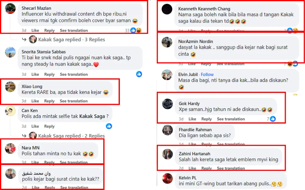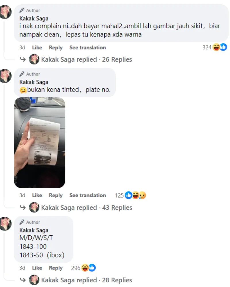 However, the influencer doesn’t seem too down about the summon as she could still crack jokes about it, like jokingly cursing about her “bad luck” when driving during the day. Kakak Saga also “lamented” that the summon ticket could have at least included a better image of her car since she paid RM300 to settle the fine. She also jokingly wondered why the photo was in black-and-white instead of being in full colour.