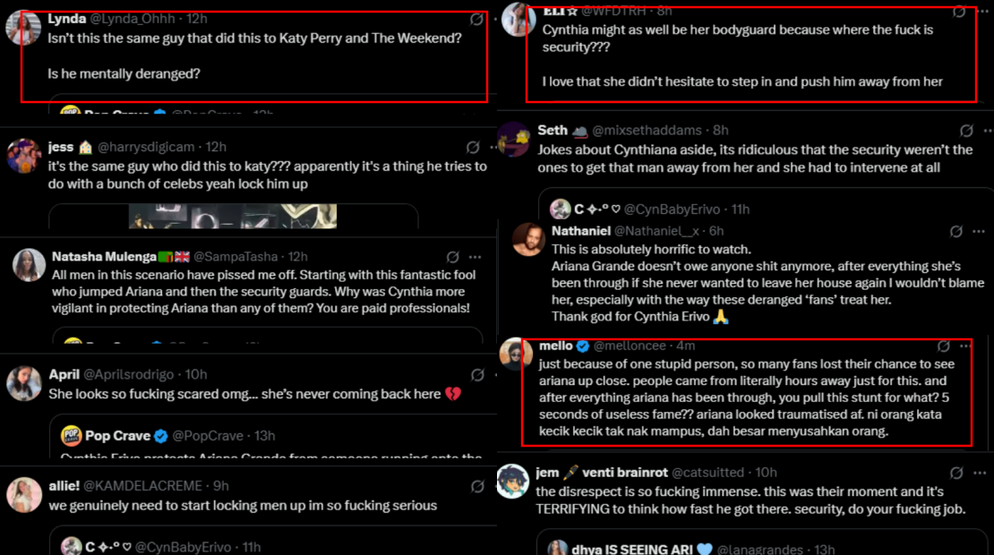 In one video, Cynthia can be heard shouting, “GET OFF HER! GET OFF HER! LET HER GO!” at the man, before security managed to restrain him. Both she and Michelle Yeoh comforted Ariana, who was visibly terrified, making sure she was unharmed. This resulted in other fans being unable to greet their idols, as the cast members were quickly rushed by security to the end of the carpet to distance themselves from the perpetrator, who attempted to run to Ariana the second time. The man was then immediately removed from the scene and was reportedly arrested for trespassing.