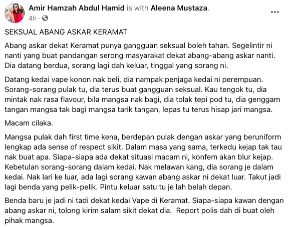 In a post that went viral on Facebook this week, one netizen who goes by the name of Amir Hamzah Abdul Hamid exposed a military personnel who had behaved indecently towards a female staff at a shop in Kuala Lumpur. The incident took place at a vape store located in Taman Keramat.