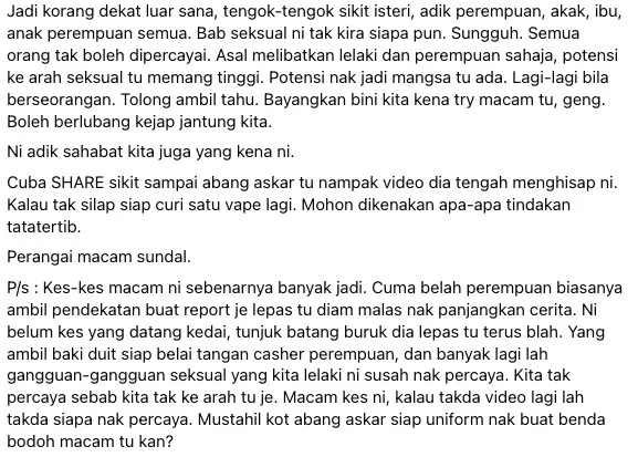 As disclosed by Amir Hamzah, the man in the military uniform came to the shop to buy some vape pods. “When he saw that the shopkeeper was a woman and alone, he sexually harassed her. He asked to taste the vape flavour, when the victim wanted to give him the vape, he pushed the edge of the pod, held her hand and then sucked the victim’s finger,” the FB user wrote.