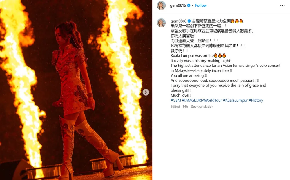 After the electrifying concert, G.E.M. took to Instagram to thank her Malaysian fans for attending the show. In the same post, the singer, whose real name is Gloria Tang, also revealed that the concert made history. The concert currently holds the record for the highest attendance for a Chinese female singer’s solo concert in Malaysia. The singer-songwriter praised the crowd, commending their passion and loud cheers during the show.