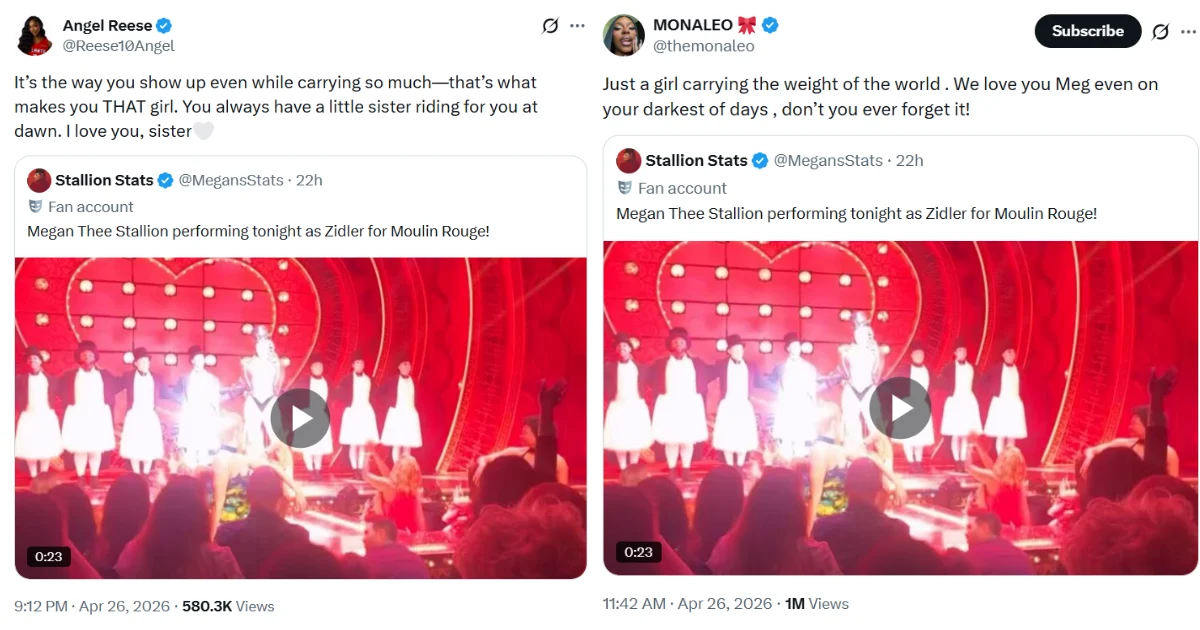 Fans are rallying support for rapper Megan Thee Stallion after she announced her breakup with basketball player Klay Thompson. Some even took to her recent Broadway performance to show their love.