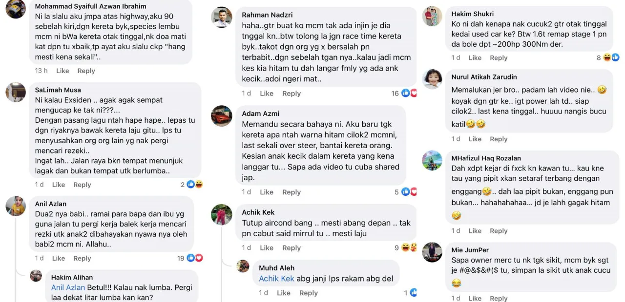 Scrolling through the comments section, a lot of netizens appeared to slam the infuriated Mercedes driver for driving recklessly. FB user Ahmad Farid commented, “Stupid. Do you think the GTR car is similar to a Kancil car? Demented bastard. Your car is just like a standard Kancil 660, racing with a standard Wira 1.6.”