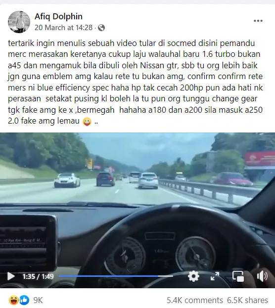 The 1-minute and 48-second long video (uploaded by a netizen known as Afiq Dolphin) shows the Mercedes driver’s failed attempt in chasing after a white Nissan Skyline GTR R35.
