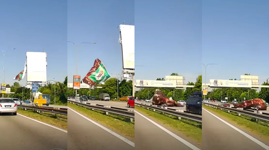 Earlier this week, a video went viral after it was posted on the Malaysia Baru News Facebook page. The clip shows a giant Milo banner detaching from a billboard along the Federal Highway and flying onto the open road, before completely engulfing a moving car. As seen in the footage, the driver immediately hit the brakes, while other vehicles kept a safe distance to avoid further danger.