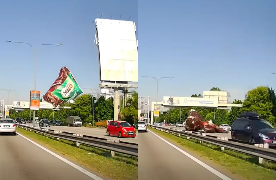 Earlier this week, a video went viral after it was posted on the Malaysia Baru News Facebook page. The clip shows a giant Milo banner detaching from a billboard along the Federal Highway and flying onto the open road, before completely engulfing a moving car. As seen in the footage, the driver immediately hit the brakes, while other vehicles kept a safe distance to avoid further danger.
