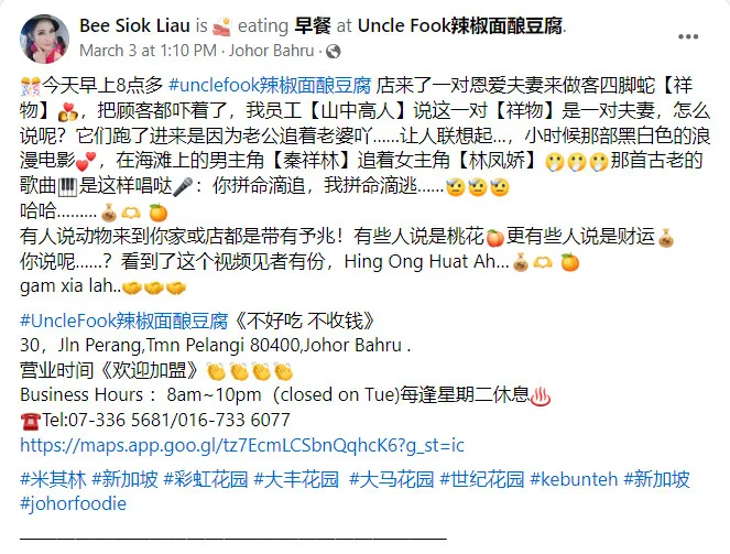Recently, a Facebook post went viral, showing an incident that happened at Uncle Fook Chili Hakka Mee (Uncle Fook辣椒面酿豆腐) restaurant in Johor Bahru. According to the post by store owner Bee Siok Liau, a pair of monitor lizards broke into the restaurant in broad daylight, frightening the many customers dining at the time. In the CCTV footage included in the post, the two monitor lizards ran into the restaurant as one of them chased the other.