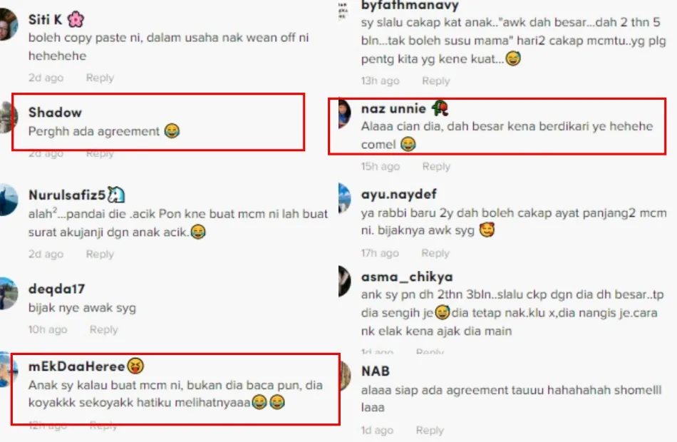 In a video posted by user @zhra_mawaddah on TikTok, the mother handed out a piece of paper to her 2-year-old daughter Zahra. The piece of paper appears to be a contract to let the child know that her mother will no longer be breastfeeding her. “I will not be drinking mom’s breast milk. I [Zahra] will have to be independent and drink Milo from a cup from now on,” the child ‘reads’ the contract aloud.
