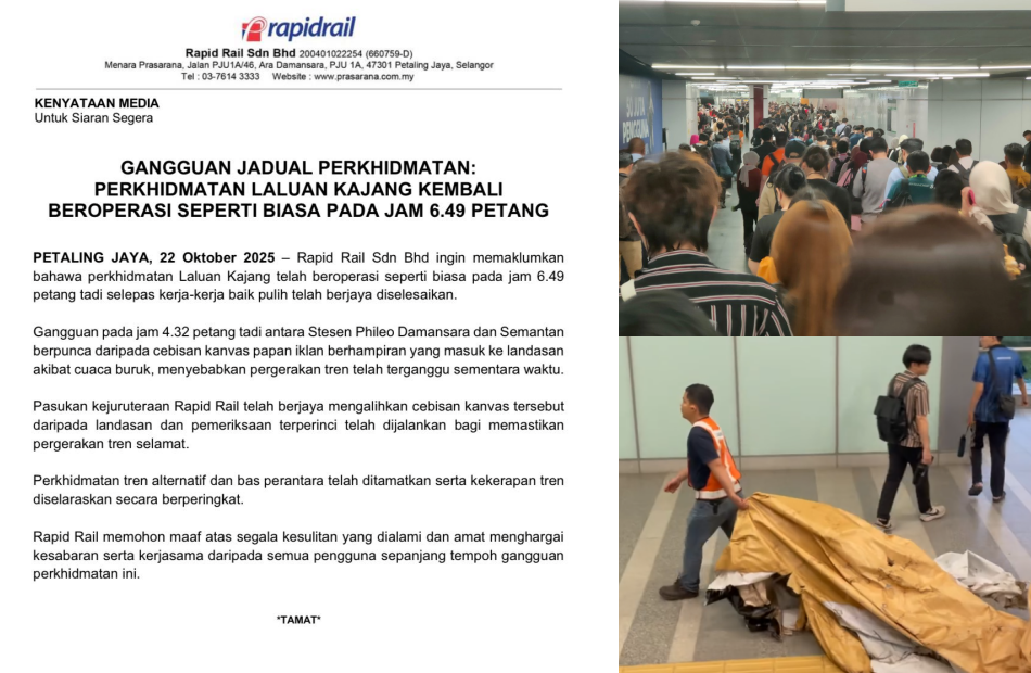 According to reports, passengers on the MRT Kajang Line were stranded for nearly 3 hours after an object fell onto the tracks between the Phileo Damansara and Pusat Bandar Damansara stations, throwing the rail system into chaos. Rapid KL confirmed that the incident occurred at around 4:32pm, with staff dispatched to assess the situation. The object that had fallen onto the tracks was later identified as pieces of a nearby billboard that had become detached due to the stormy weather.