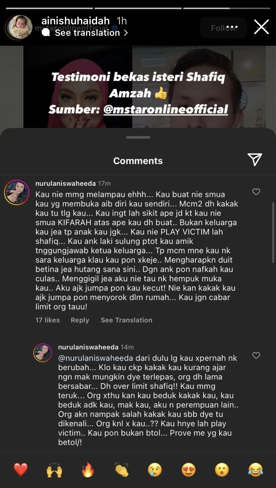 If her claims about her brother being abusive and manipulative weren’t convincing enough, the Asian Wave award winner’s ex-sister-in-law, Nurul Anis Waheeda, Syafiq’s ex-wife, came to her defence by revealing her former spouse’s true self. In a comment section of an Instagram post, Nurul Anis slammed her ex-husband for taking advantage of his sister’s wealth so he wouldn’t have to work.