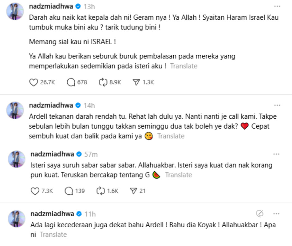 Nadzmi Adhwa took to Threads to inform fans that his wife, Ardell Aryana, along with other activists, had been released and would be returning to their respective countries. He also expressed his anger upon learning that his spouse was among those reportedly subjected to torture by Israeli forces due to her status as a public figure.